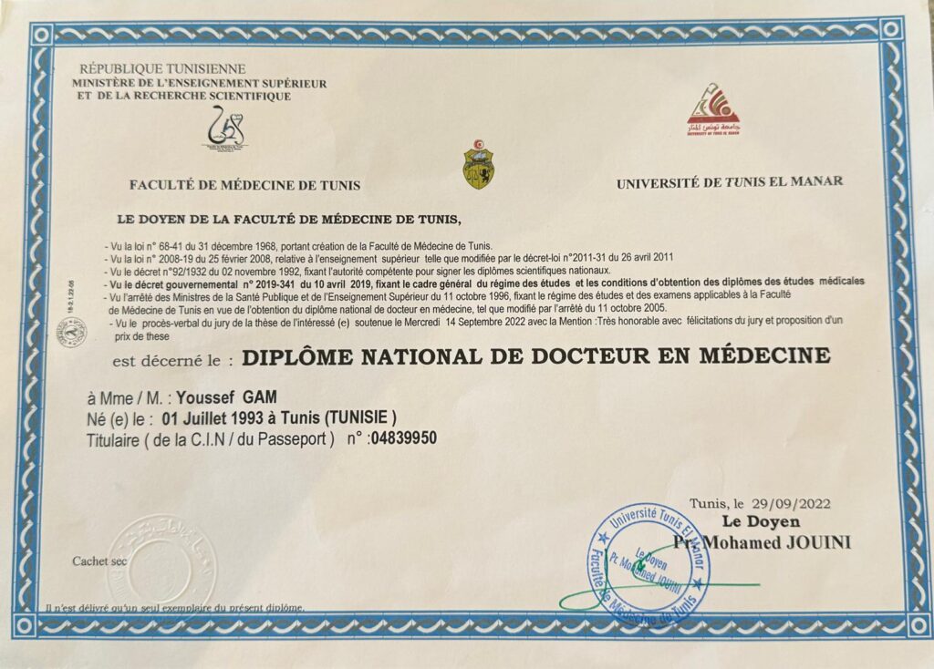 Le Dr Youssef Gam est un médecin spécialiste en chirurgie plastique, réparatrice et esthétique, inscrit au Tableau national de l’Ordre des médecins de Tunisie sous le numéro 28345. Né le 1er juillet 1993 à Tunis, il répond à toutes les conditions légales prévues par la loi tunisienne pour exercer la médecine. Son inscription et son agrément officiel délivrés par le Conseil Régional de l’Ordre des Médecins de Tunis confirment son statut de praticien qualifié et reconnu dans son domaine. Cette attestation, signée par le président de l’Ordre, le Dr Mohamed Allouche, et valable jusqu’au 31 juillet 2025, atteste de sa légitimité professionnelle et de sa compétence à exercer en toute conformité avec les normes médicales en vigueur en Tunisie.