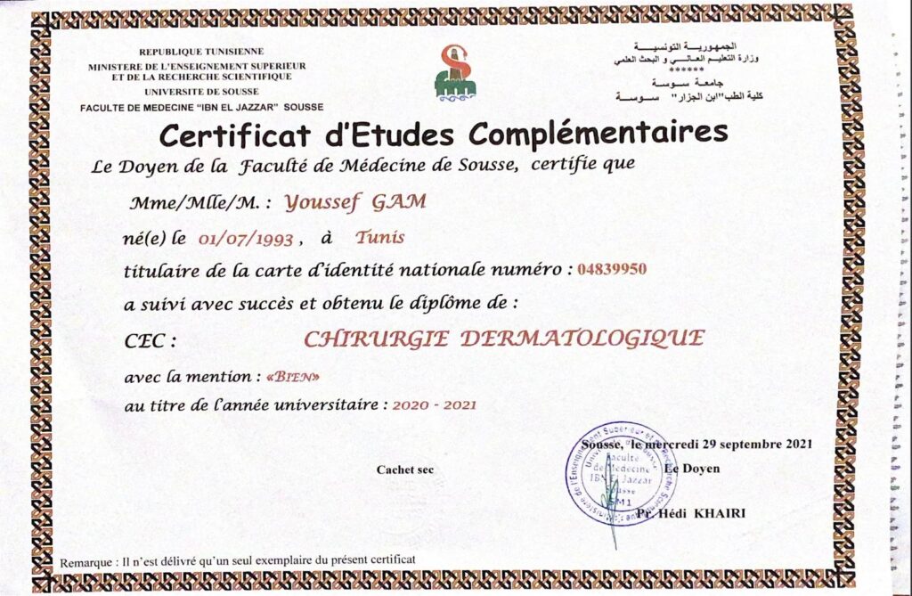 Titulaire d’un diplôme en chirurgie plastique, reconstructive et esthétique, le Dr Youssef Gam s’est formé en Tunisie et à l’international. Il a participé à de nombreux congrès spécialisés et ateliers de perfectionnement en Europe et en Asie, notamment dans les domaines du lipofilling, de la liposculpture haute définition et des technologies de rajeunissement par radiofréquence.